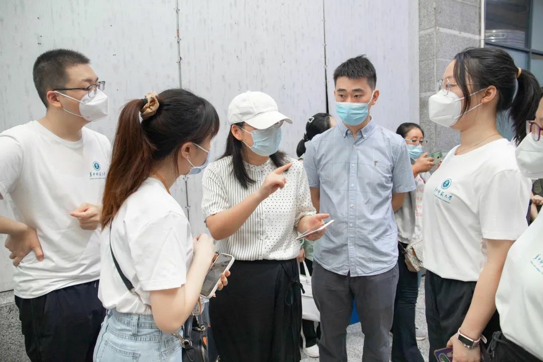 志愿者们依次检查新生的健康码与行程码,并引导同学和家长在等候区入坐休息。