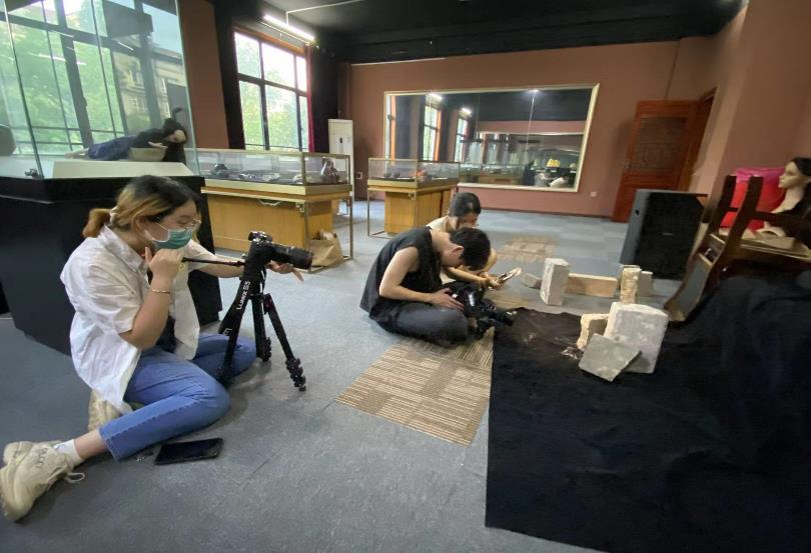 团队成员利用道具拍摄古砖细节