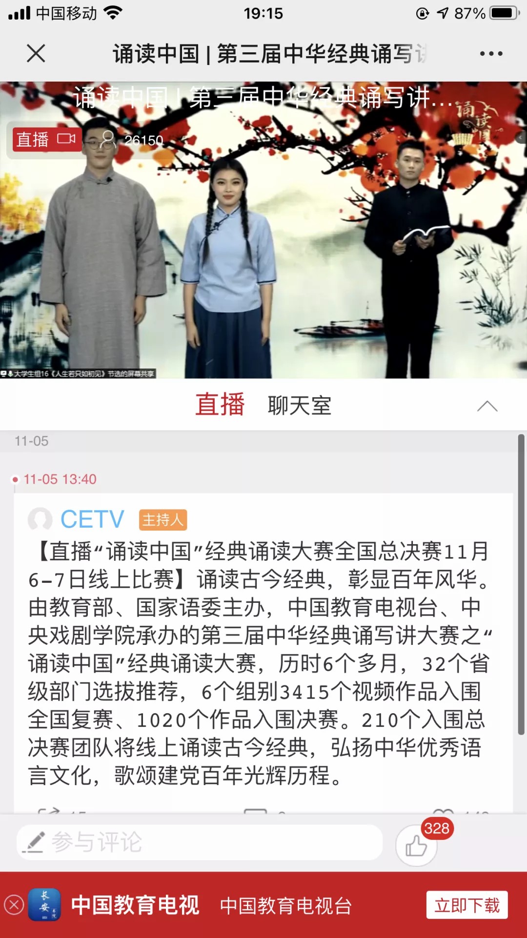 本次大赛历时六个多月,经过32个省级部门选拔推荐,六个组别共3415个视频入围全国复赛,1020个作品入围决赛,210个参赛团队入围总决赛,并以线上直播的形式共同诵读经典。