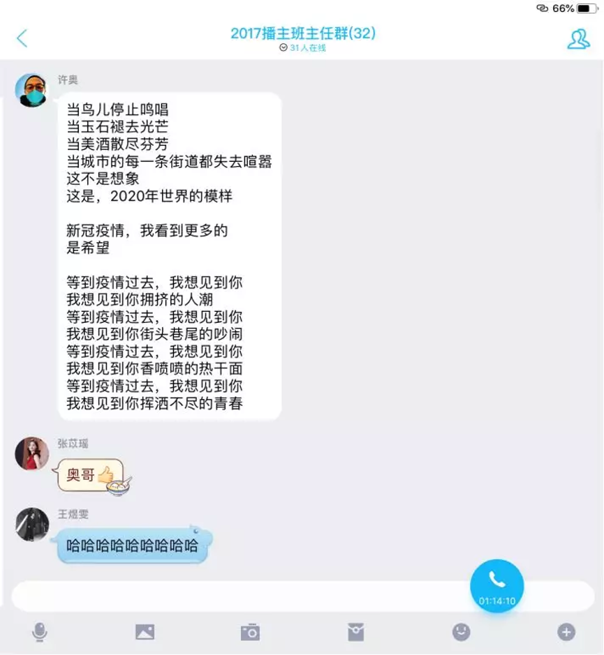 各年级班主任群体在学校开学后,除了完成日常网课教学外,又线上召开班会,班主任段然老师逐个了解学生在家生活、身体、情绪以及是否需要学院帮助解决问题;班主任严利华老师专门收集了大家各项疑问;1705班班主任王丽老师不仅对班级每位同学的情况进行细致的了解,还对学生所在省市的防疫措施也进行了询问,还与同学们进行有关疫情知识的互动问答,第一位回答正确的同学将会获得王老师的专属红包。在第四个问答环节,许奥同学的原创诗获得了老师和同学们的赞赏。