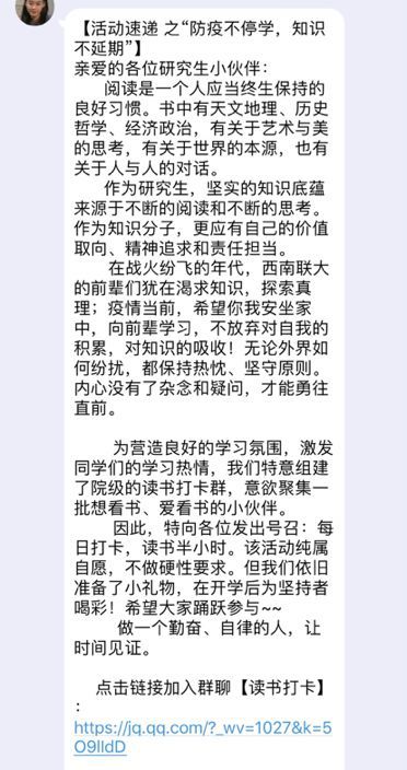 学院研究生辅导员前后发布《致新闻传播学院全体研究生一封信》、《致新闻传播学院2020届毕业生研究生一封信》,担任“网络主播”,在线点名;在了解研究生日常“宅家”生活基础上,号召研究生调整作息时间;组织研究生开展“防疫不妨学,知识不延期”读书打卡活动,每天至少看书半小时,相约打卡,激发学生学习热情,做勤奋努力的当代硕士生。