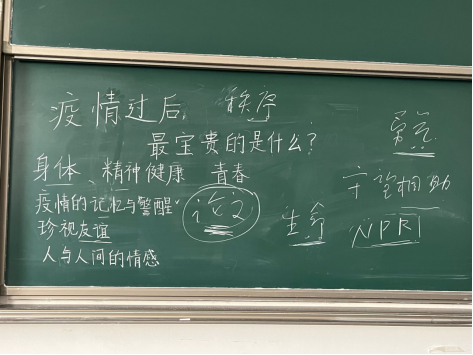 为了使同学们总结疫情生活,适应新学期学习生活,许永超老师提出“疫情过后反思最宝贵的是什么?”的问题,同学们积极思考讨论,做出了回答——健康、青春、珍惜、警醒......同学们认为,在疫情期间不仅深刻认识感受到了生命的脆弱荷人与人守望相助的力量,也认识到了在党的坚强领导下,社会秩序稳定性和重要性。