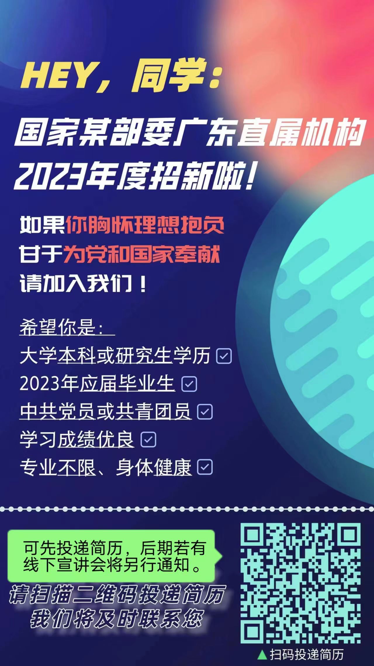 【专业及就业地】专业不限,就业地点可选择城市多。请符合条件的你扫码查看并报名。后期会有专门线下宣讲会,请大家留意,并带上纸质简历参加!