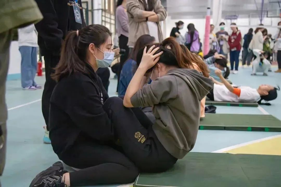 抵达检录地点后,裁判告知黄太蕊,只有满三十人才能开始比赛。黄太蕊立即在年级群内求助,希望同学们可以积极参与。消息发出后不久,我院部分女生陆续赶到,很快就组满了30人的参赛队伍。
