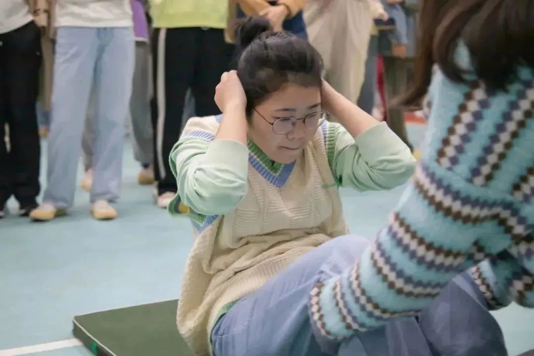 比赛分为五组,每组六个人。参赛选手相互鼓励着,依次在垫子上调整好仰卧姿势。随着裁判一声令下,赛场上选手们的身影此起彼伏。选手们起初劲头十足,动作迅速,到比赛后半段,就渐渐显得吃力起来,脸涨得通红,发丝凌乱。率先做完仰卧起坐的王碧莹说,自己已经尽了全力,并希望后面的同学可以继续努力。后半场的选手吸取了经验,稳定住了自己的节奏,最终所有人顺利完成了比赛。