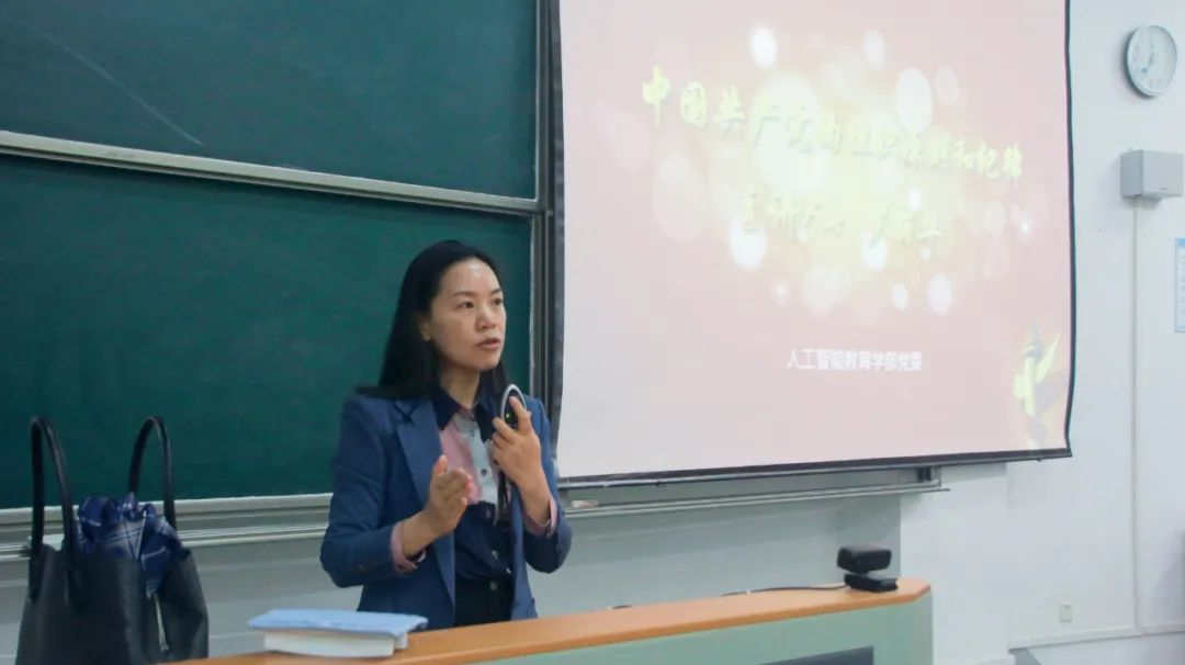 人工智能教育学部党委书记罗丽华同志以“中国共产党的组织原则和纪律”为题,从“什么是民主集中制”“为什么要坚持民主集中制”“怎样坚持和健全民主集中制”三方面讲解组织原则,从内容、特点与如何遵守和维护三方面讲解党的纪律。