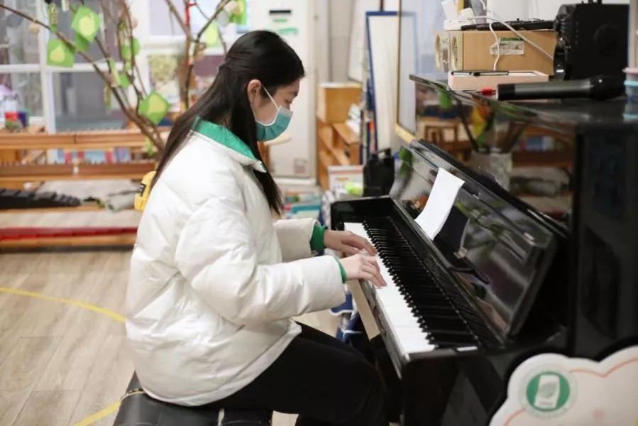 在展示互动环节,志愿者蔡祎涵根据刚刚小朋友唱的《外婆的澎湖湾》,随即写下简谱并根据谱子弹奏。小朋友们都异常兴奋。在志愿者的引导下,他们踩着拍子跟着节奏,一起合唱了班歌。最后,在美妙的音乐中,此次课堂顺利完成!