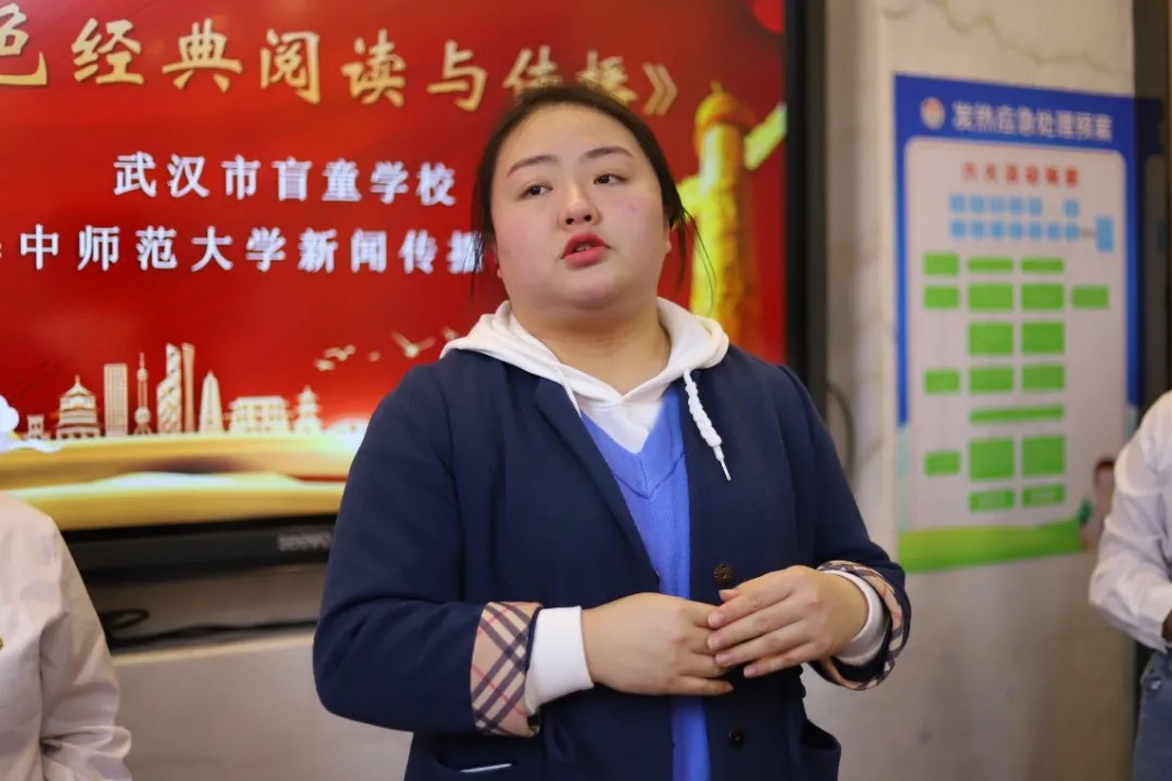 华师新闻传播学院辛静老师作为此次课程的带队老师做了总结:“感谢盲校师生们对这次实践课的支持与肯定。我们希望这个课程是一个良好的开端,让我们共同从红色经典中汲取养分和动力,唤醒红色记忆,激发攻坚克难的勇气和创新的力量。