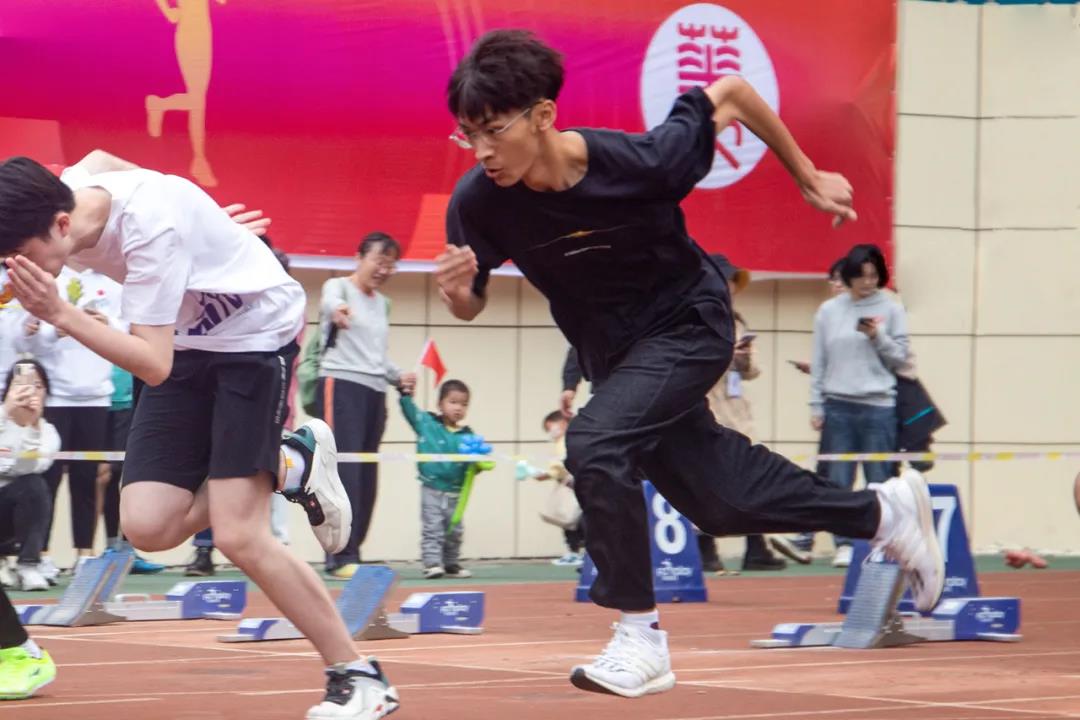 邓子青随后上场。赛前他低头小跳着舒展身体,缓解紧张情绪。听到裁判口令后,他目视前方摆出站立式跑姿,枪响瞬间便一冲而出。比赛虽胶着,但他始终保持冲劲,奋力向前冲刺加速,在铿锵的鼓声中,他一鼓作气,越过终点线。