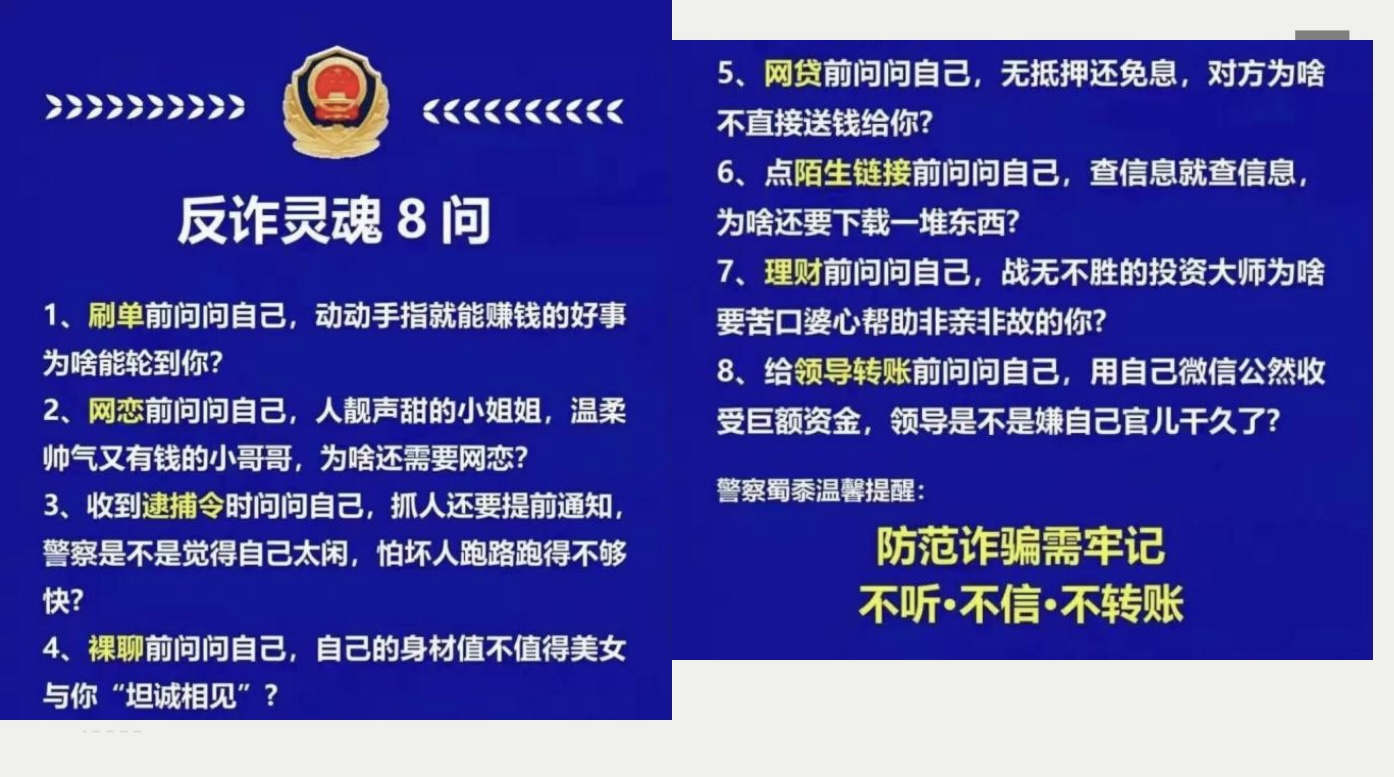 点名完毕后,李鸿老师先是结合近期洪山区高校电信网络诈骗事件高发这一情况,分别从被骗方式、电信诈骗常见手法及防范措施等方面展开教育。尤其是下图的“反诈灵魂8问”,更是让人感受到了人民警察为了反诈骗有多苦口婆心。