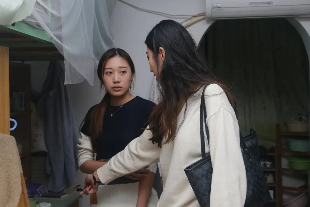 一行人到达东九宿舍时,迎新晚会刚刚开始。同学们正搬好小板凳,抱着零食,围坐在电脑前,准备一起观看节目。听到查寝的敲门声,111宿舍长李梓鸥急忙打开门,热情地向杜雨薇问好,并信心十足地带她检查自己的宿舍。杜雨薇对宿舍的整洁干净表示肯定,并仔细检查宿舍内是否存在违规电器等安全隐患。杜雨薇亦叮嘱同学们换季时节注意身体。