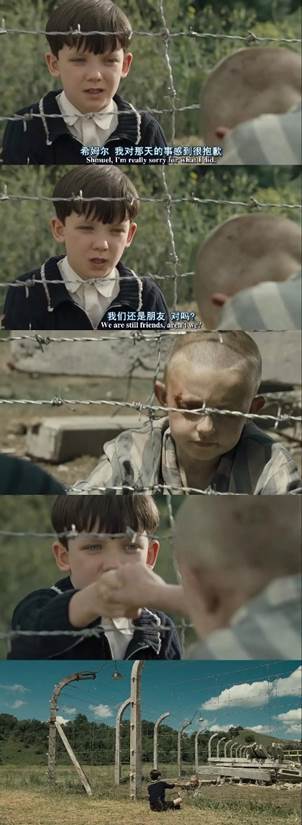他远离城里的小伙伴,一个人生活在“农场”里,小小年纪却没有玩伴。极度喜欢探险的他每每偷偷从后门溜出去,隔着电网,他认识了在这儿的唯一一个朋友——同龄犹太男孩施穆尔。