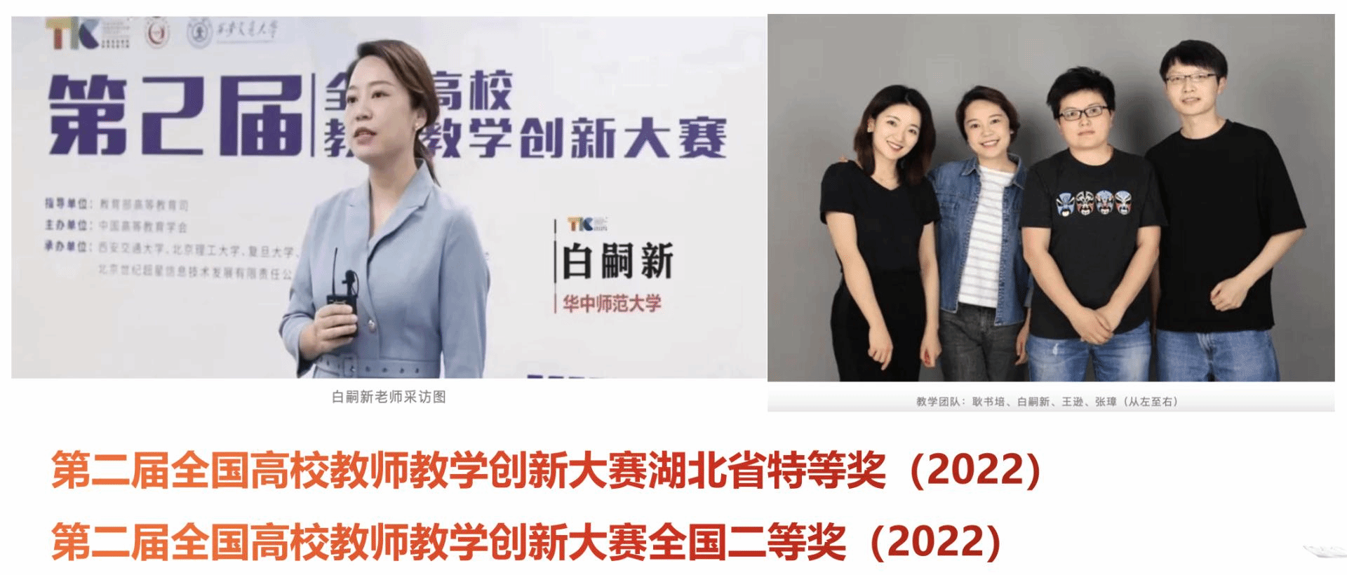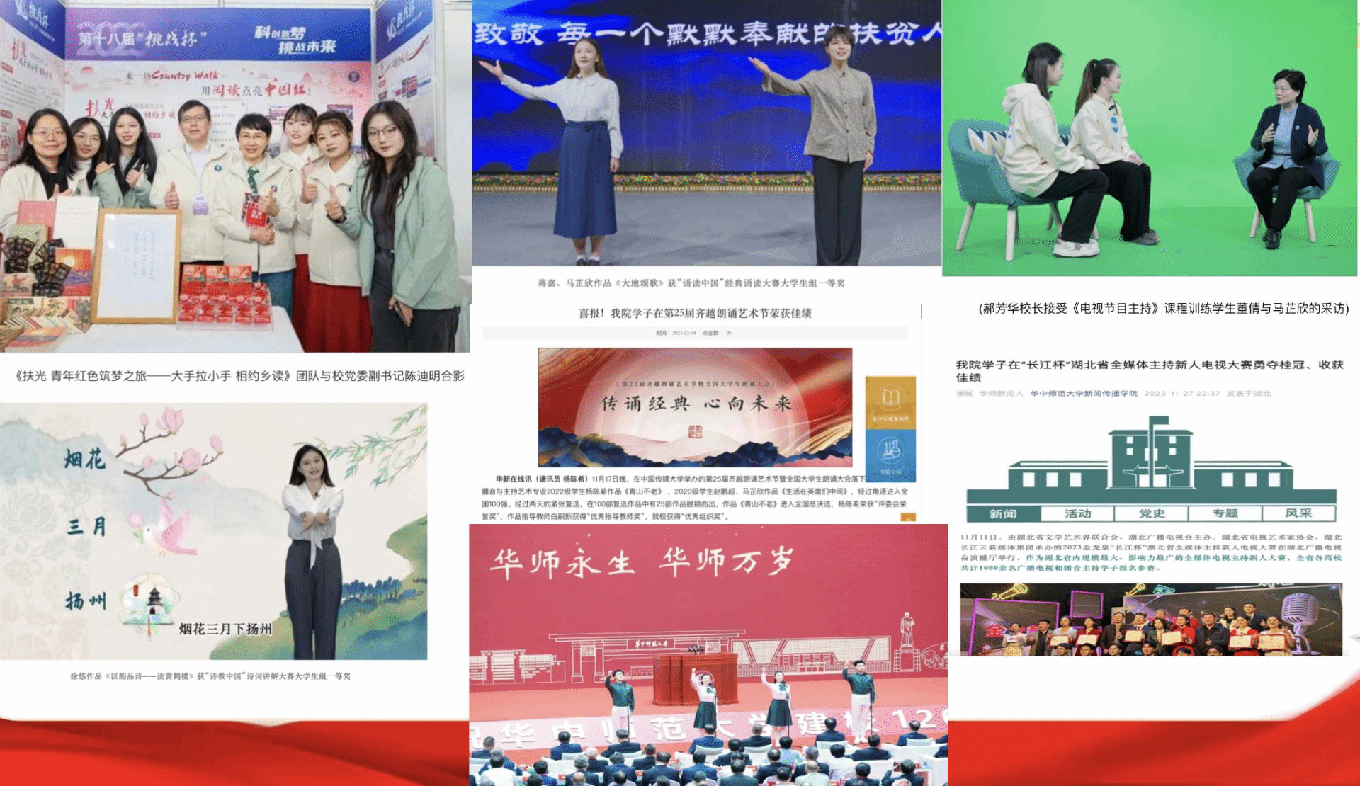 团队深耕教学,专业领先。播主系两门本科生课程《红色经典阅读与传播》、《出镜记者现场报道》获得2023年省级一流课程。《红色经典阅读》课程开创了走读红色基地,领读红色经典,整本书阅读和阅读演诵汇四大主体活动;以专家导读、名家精读、校际合读、学生共读四种阅读方式,演绎红色经典阅读的魅力。课程获得广泛好评,中央电视台新闻频道播出专题报道,赞誉其“别样的课堂——走读红色经典“;教育部官网称赞其是”学生真心喜爱,终身受益的红色金课“等。《出境记者现场报道》获得2022年第二届全国高校教师创新大赛湖北省特等奖、全国高校教师教学创新大赛全国二等奖的好成绩。