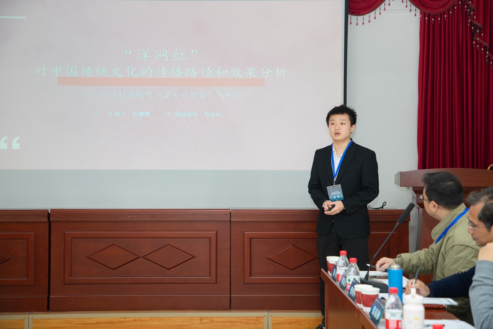 分论坛“网络文化与国际传播”由华中师范大学新闻传播学院副院长陈科、张勇军教授和余欢讲师评议,2021级本科生苏子怡主持。共有5组同学依次发言,并展示他们在课程学习中取得的研究成果。