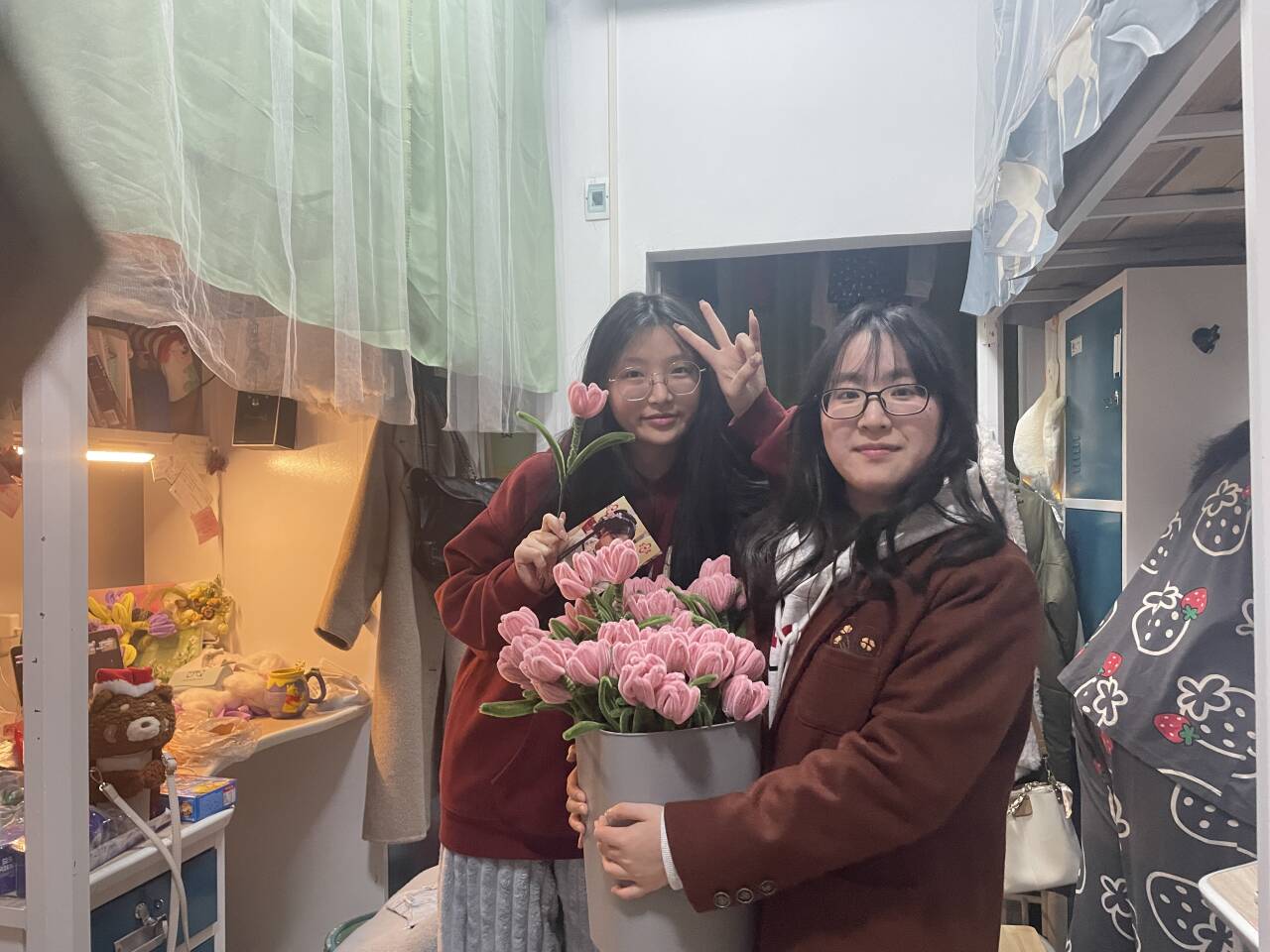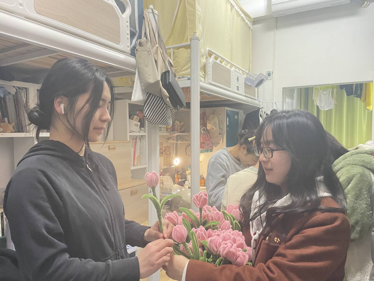 在晚上,精心制作的扭扭花和明信片一一送到了女生们的手中,收到礼物的女同学们脸上洋溢出灿烂的笑容,每一份扭扭花和明信片都成为了共同回忆的载体、见证着深厚情谊的独特印记。