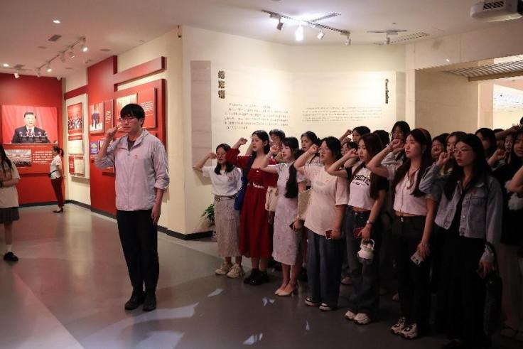 参观完中国共产党纪律建设历史陈列馆后,在华中师范大学新闻传播学院研究生第一党支部副书记邹智鹏同志的带领下,两支部全体党员共同重温了入党誓词。