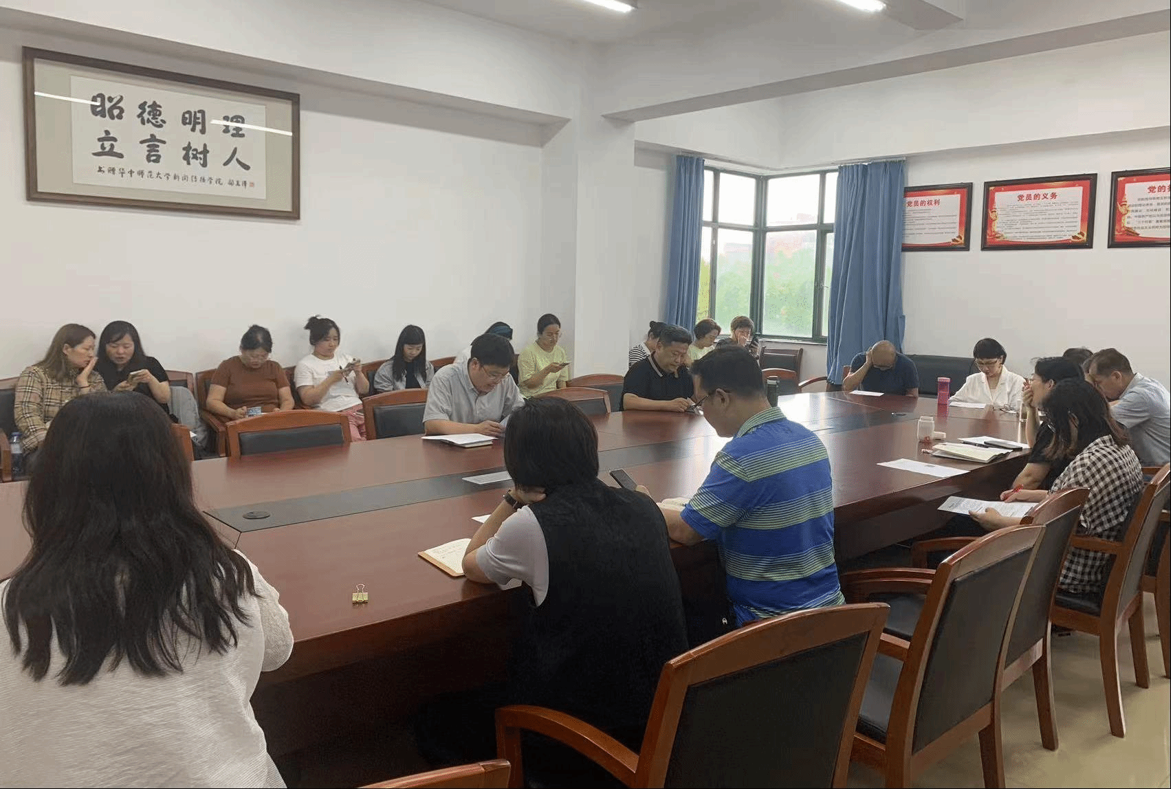 6月28日下午,新闻传播学院在827会议室召开全体教职工大会,组织开展师德师风专题学习并布置期末工作。学院党委书记夏守信主持会议并讲话,学院全体教职工参加会议。