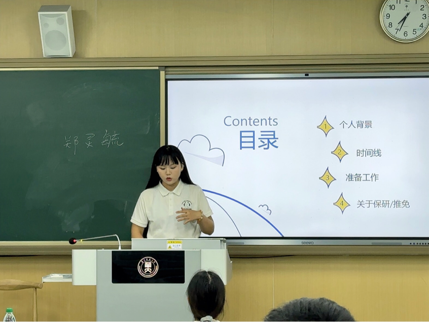 班会伊始,研究生郑灵毓同学以自身经历为蓝本,为在座的同学们分享了她保研及申请英国留学的宝贵经验。她详细讲述了个人背景、大学四年的成长轨迹和前期的准备工作,特别是针对推免保研的注意事项,她强调:“同学们应在研读学校推免保研细则的基础上,准确找到自己的优势定位,同时不断丰富自己的硬性和软性经历。”此外,她还贴心地推荐了一些选校、教育和留学交流的优质博主与公众号,为有意出国留学的同学提供了实用的参考信息。