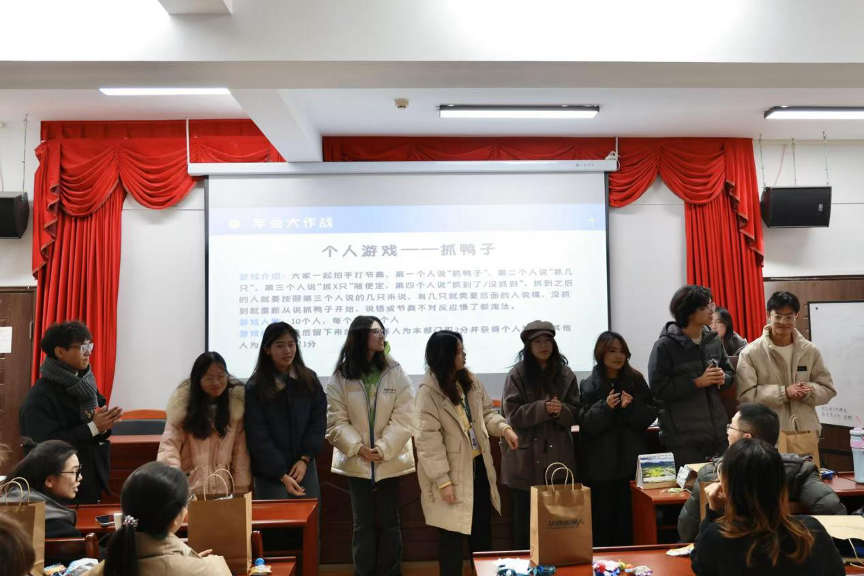 表演结束后,年会迎来了最重头的部分——游戏环节。首先进行的是单人游戏,包括数鸭子、喊数字、逛三园(新闻中心版)等项目。每个部门各派出两名代表参加,经过紧张刺激的角逐,最后获胜的两位同学不仅能够抽签获得神秘奖励,同时也为自己的部门赢得了宝贵的积分。单人游戏结束后,集体游戏紧随其后。在你画我猜、击鼓传花等游戏中,各部门成员都热情高涨,努力为自己的部门争取积分,现场气氛热烈,欢声笑语不断。