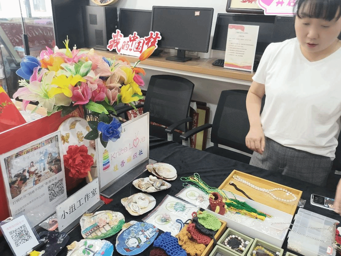 不仅如此,在工作站的现场还能看到居民制作的文化产品,如手串的珍珠饰品、剪纸艺术品、勾丝花等等。打铜社区还成立了自己的“直播间”,背景板、灯光、支架等设备一应俱全,视频内容涉及辖区商户的推广、假期托管班师生互动等等。
