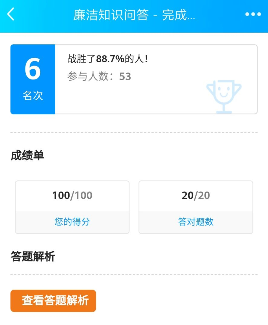 (通讯员:杨玉婷)10月13日,根据学校纪委的统一要求,新闻传播学院19级专硕班全体同学开展了一场线上廉洁知识问答主题活动,活动中大家积极响应,并纷纷晒出自己的成绩单。本次“廉洁知识问答”活动覆盖专硕班全体成员,参与率100%,参与人数51人,答题优秀率高达70%,总体取得了不错的反响。