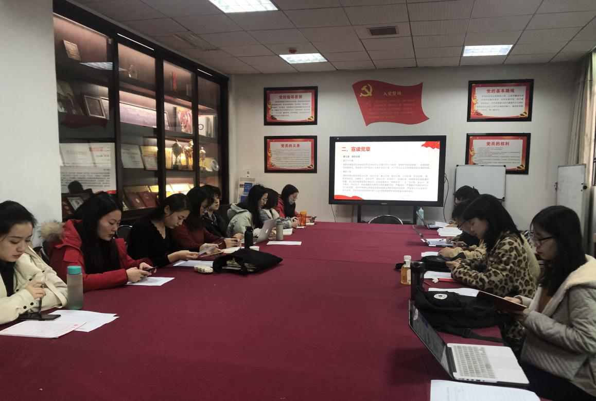 会议伊始,由彭程程领誓,与会成员重温入党誓词。董丹霞领头宣读党章,带领大家学习党章片段。宣读完毕,党支书李人扬分享《党的十九届四中全会<决定>学习辅导百问》学习心得及优秀党员事迹,阳华分享《求是》杂志学习心得,支部成员纷纷认真聆听学习。