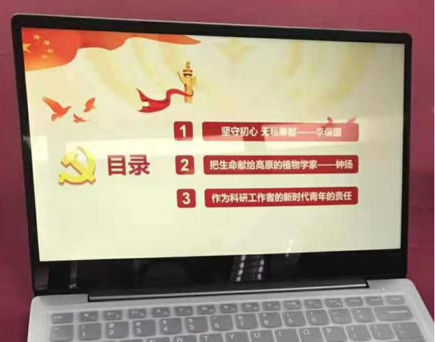 此次党课学习包括两方面内容,其一是讲述作为人民楷模的两位科研工作者李保国和钟扬的故事,其二是有针对性地剖析作为科研工作者的新时代青年的责任。