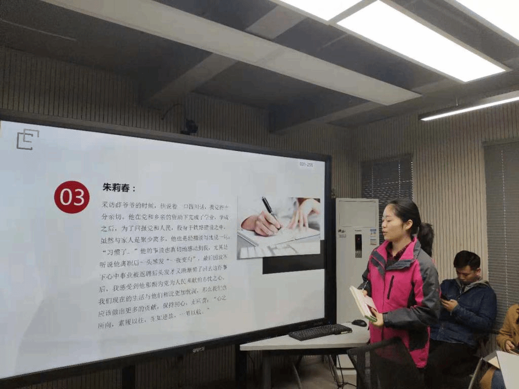 新闻传播学院2016级本科生董若分享了她们小组采访的身边老党员,小组成员薛晓晗的爷爷薛治琪是一名铁路架桥机设计工程师。心中有梦、心中更有路的他是一名勤奋好学、默默奉献为国家铁路事业做出诸多贡献的杰出老党员。此后三个小组的采访对象都是身边的优秀党员同志,有一心专注于学生工作的研究生辅导员李鸿,还有坚守新闻工作者党性原则的新闻传播学院院长江作苏,以及为学生群体服务的社区辅导员滕笑丽。这些生活中经常接触到的党员同志身上充满着社会正能量,李鸿同志的身体力行、为他人早想;江作苏同志的高扬理想、脚踏实地;滕笑丽同志的为学生群体服务。身边党员同志的优秀精神令人敬佩,展示了一批共产党员的信仰与追求。