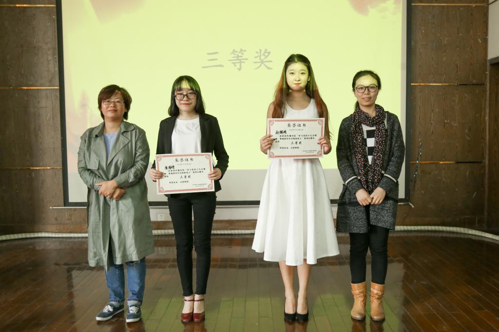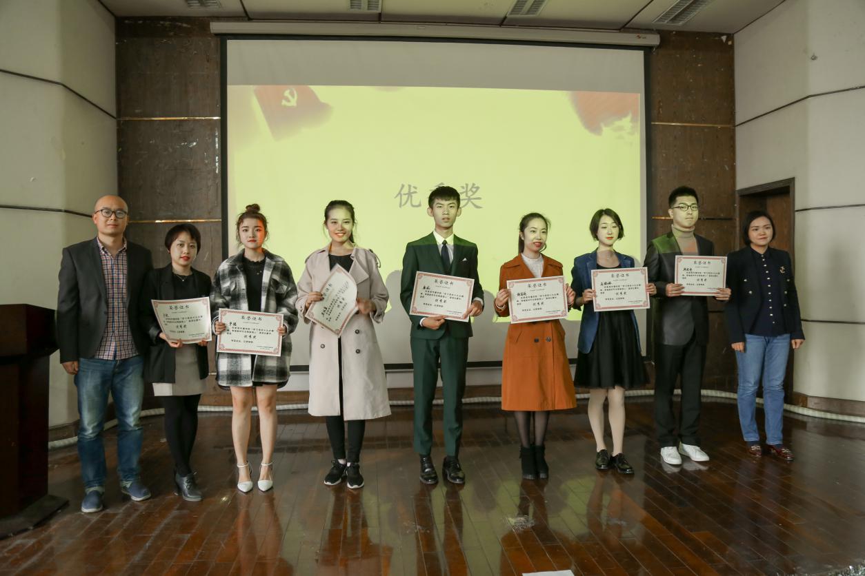 严珺、李传真、卢欣、唐屹、朱晓琳、毕浩洋、施佳丽七位选手获得优秀奖,新闻传播学院刘琼老师和许永超老师为其颁奖。