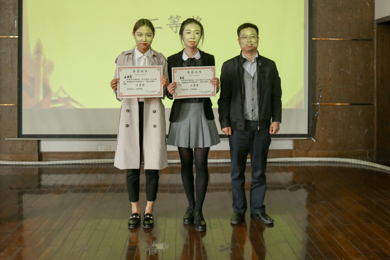 朱晓雪、曾琦获得二等奖,新闻传播学院分党委副书记夏守信为其颁奖。