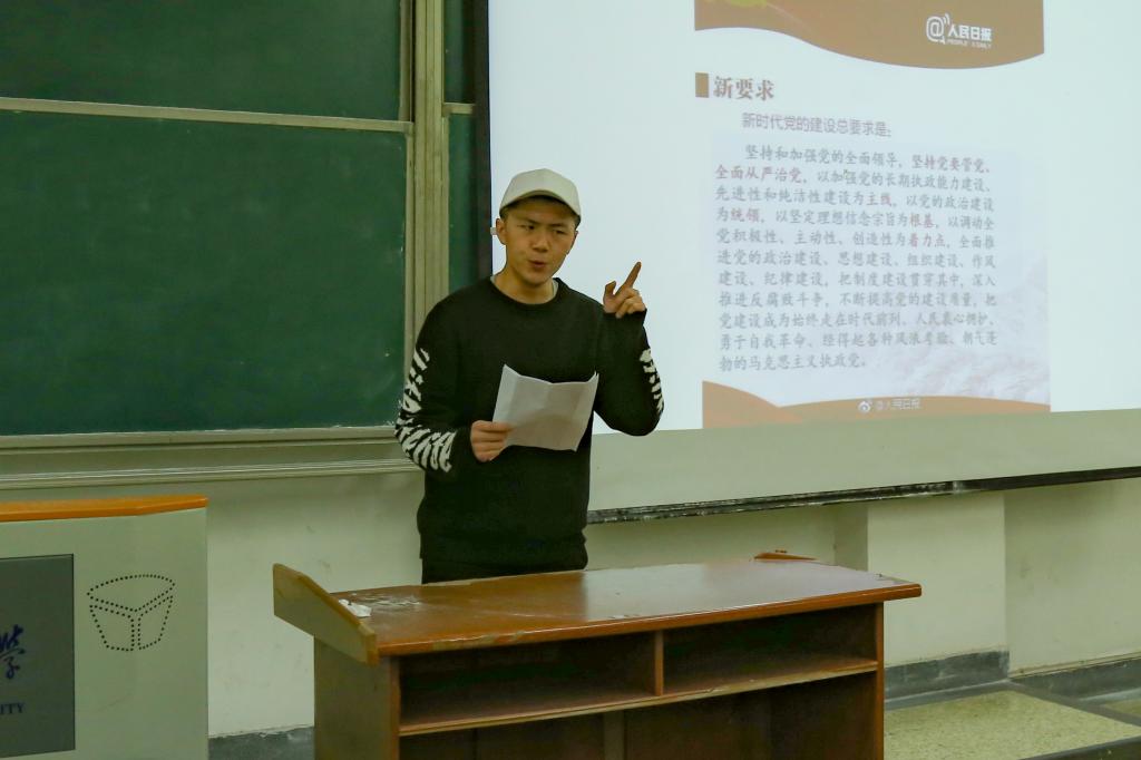 何子轩以对十九大中提出的新时代、新矛盾、新思想、新方略、新目标、新使命、新要求七个方面的解读开始了此次活动。何子轩认为,作为党员就不能忘记共产党人的初心与使命,他说:“我们年级是党员的同学和励志成为党员的同学都应该有这样的胸怀,并以此对照自己在学习生活中的具体行为。”