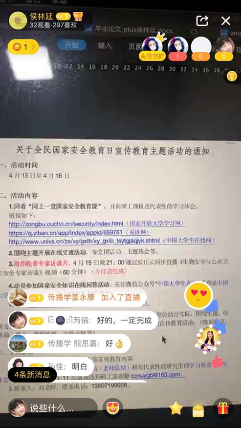 2017级传播班采用了为了更好宣传国家安全教育,提高同学们的学习积极性和互动性,采取了空间直播的方式,利用直播弹幕和真人出境的形式拉近了同学们的距离。通过共同分享国家安全的内涵和外延,并借助线上答题的方式来科普有关国家安全的知识,检验了大家在这次宣传教育活动中的学习成果。而且全班同学在线上答题活动中都拿到了不错的成绩,多名同学得到了满分。
