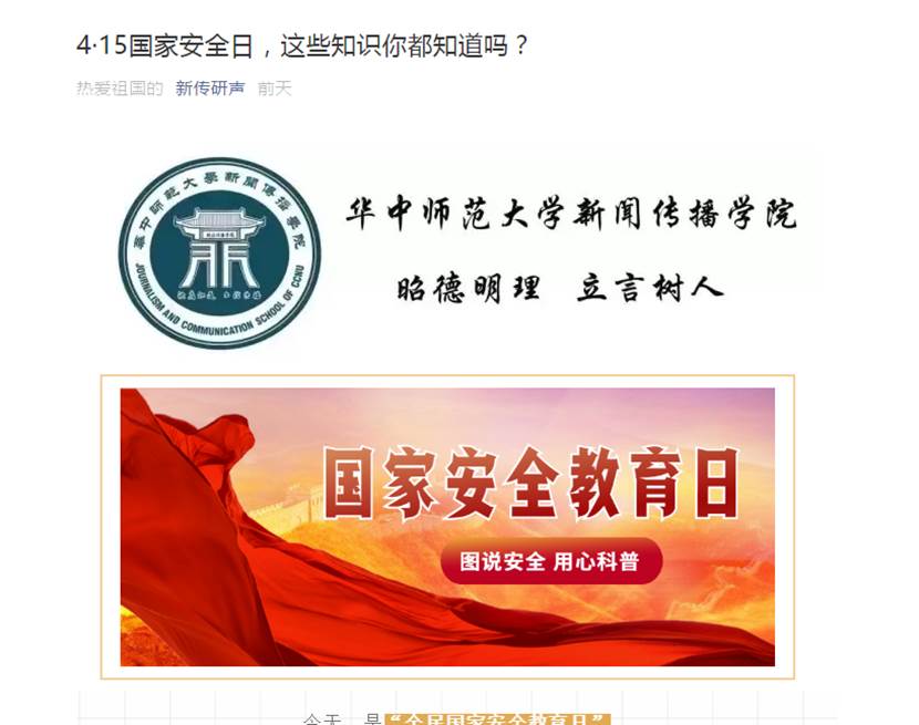 我院一直致力于培养党的宣传工作的接班人,也一直以宣传党的理念、方针为己任。在本次国家安全教育系列活动中,我们也充分利用我院的宣传阵地——新传研声公众号对国家安全教育相关知识进行了实时推送,并转发至各个年级群里。