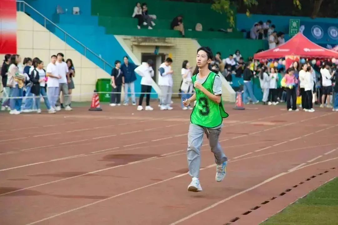 一声枪响,选手们纷纷冲出起跑线。最初,杨思辑按照自己的节奏奔跑着,并在最后100米时开始持续加速,直至冲过终点线。而在本次比赛中,和杨思辑一起奔跑的还有我院2022级未参赛的男生们,他们轮流高举院旗,为我院参赛选手加油助威。赛后,杨思辑回忆道:“听见场外老师和同学的加油声时,我就感觉有力气坚持下去了。”